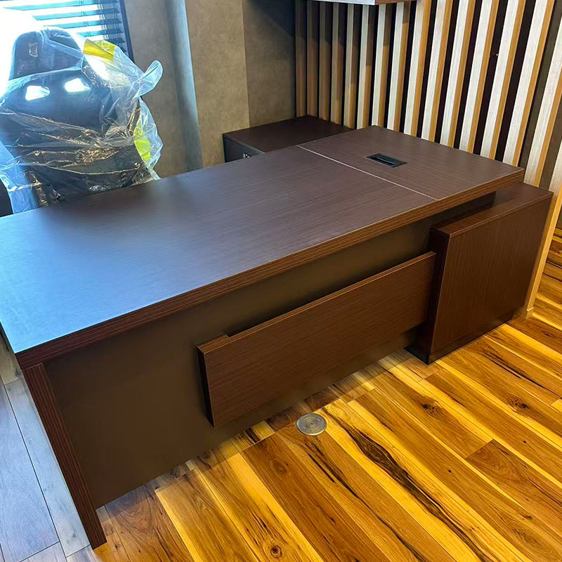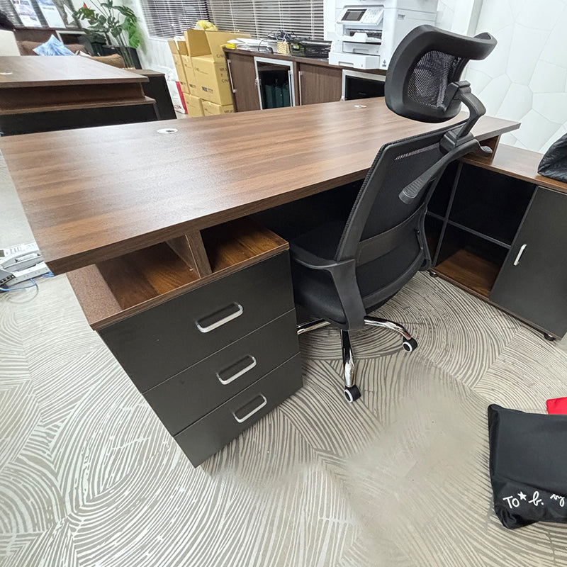 このたび、ある企業様よりこちらの役員デスクをご注文いただきました。この役員デスクは、落ち着きと深みのある木目調デザインが特徴です。重厚感と洗練された雰囲気を併せ持ち、役員室の空間に自然に溶け込みながら、風格ある印象を醸し出します。広々とした天板は実用性も高く、側面には大型の収納キャビネットと引き出しを完備。書類や備品をすっきりと整理整頓できる点が、本製品の大きな魅力でございます。オフィス環境が整うことで、業務効率の向上にも自然とつながります。