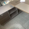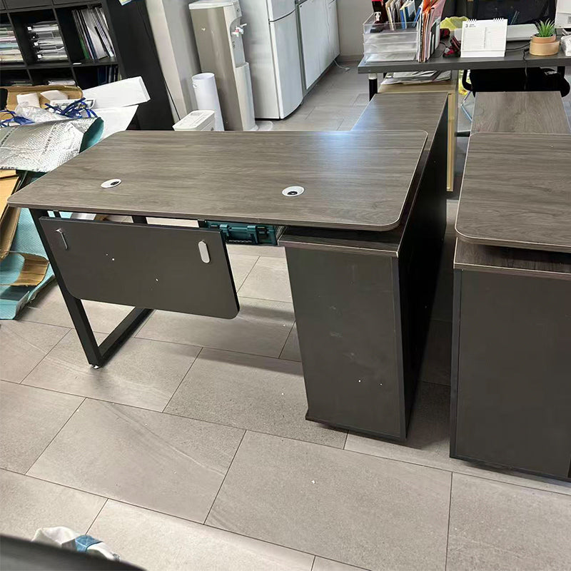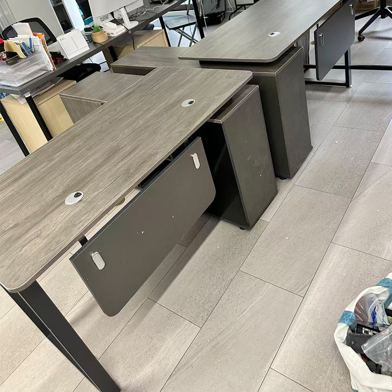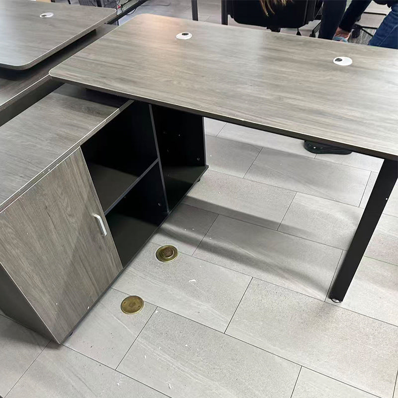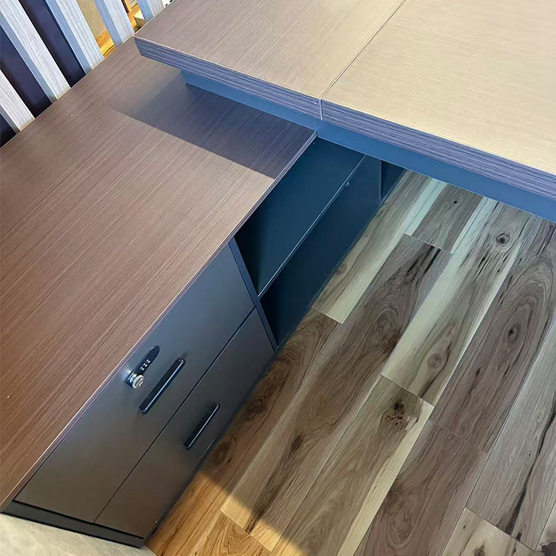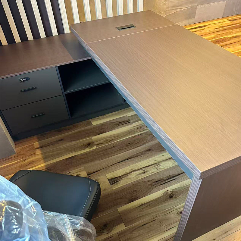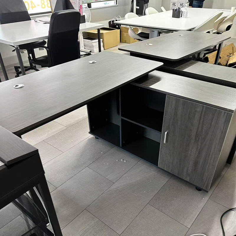 選ばれたデスクは、温かみのある木目調の天板が特徴で、デザインが空間を効率よく活用すると同時に、スタイリッシュな印象をも漂わせています。サイドキャビネットは必書類やオフィス用品を整理整頓するのに役立ち、幕板がプライバシーを保ちつつ、オフィスをより一層洗練させます。