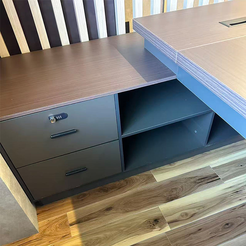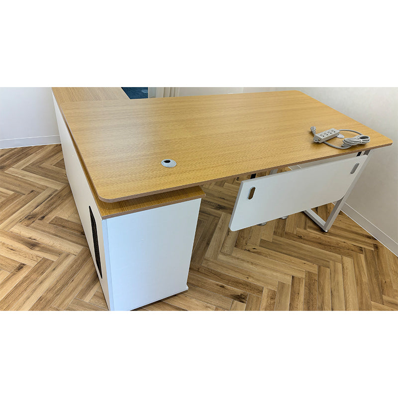 本製品は、落ち着いた木目調の色合いと重厚なデザインが特徴です。サイドキャビネットには業務に必要な書類や備品をたっぷり収納でき、さらに引き出しには暗証番号式ロックを装備。セキュリティ面にも配慮した設計となっております。