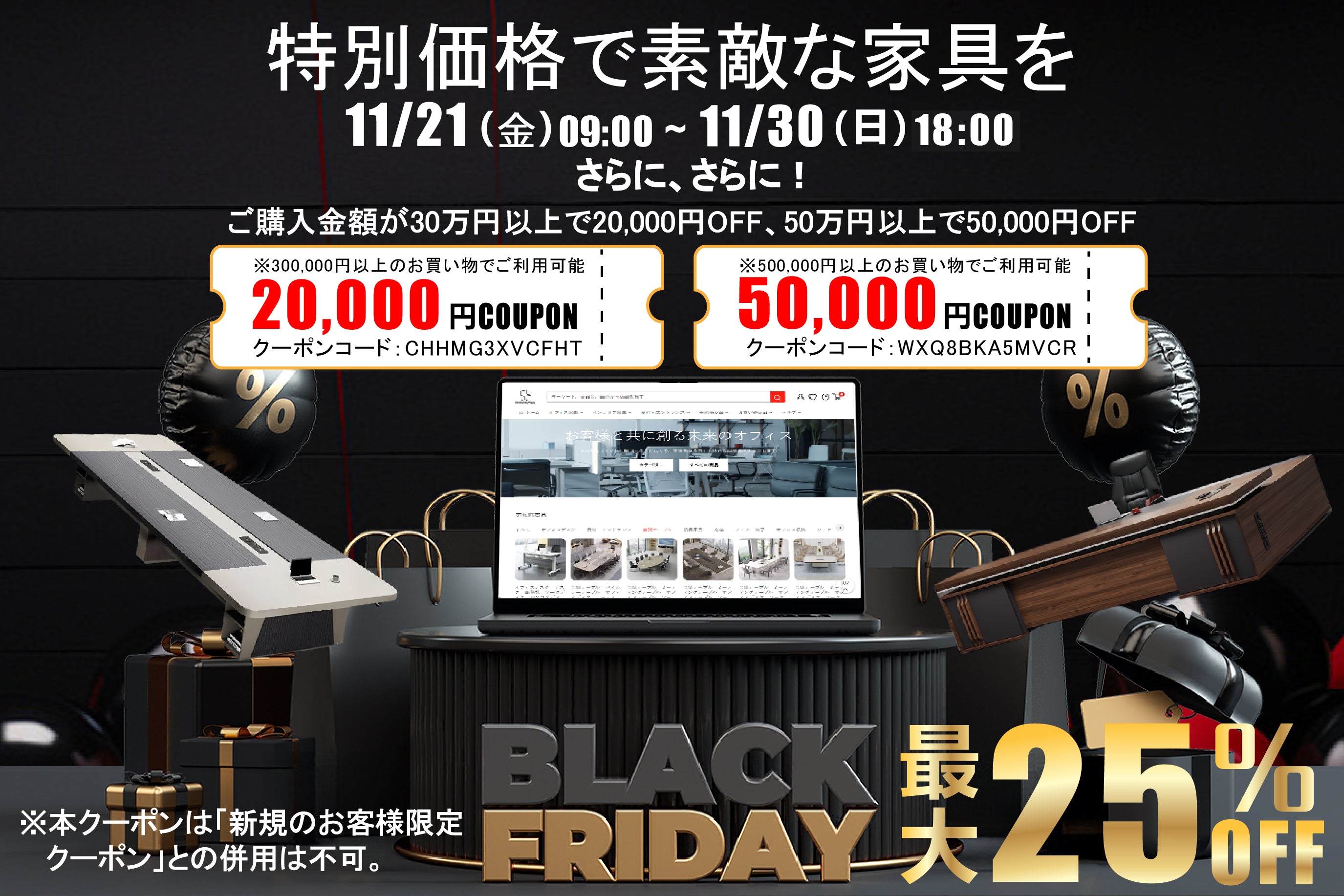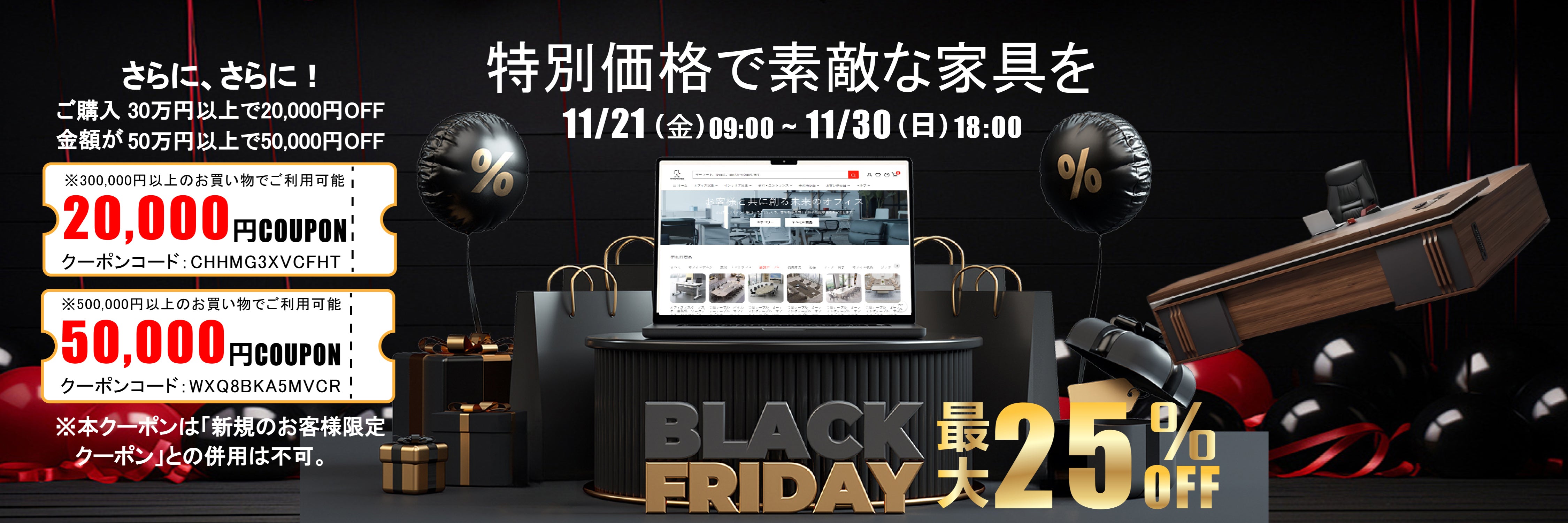 記念すべき当店初のブラックフライデーがついに登場♪ 皆様のお買い物を応援するため、特別に 「最大50,000円オフ」 のクーポンをご用意しました! クーポンは 期間限定 で配布中。ぜひお早めにご利用ください!